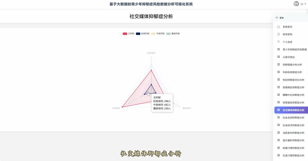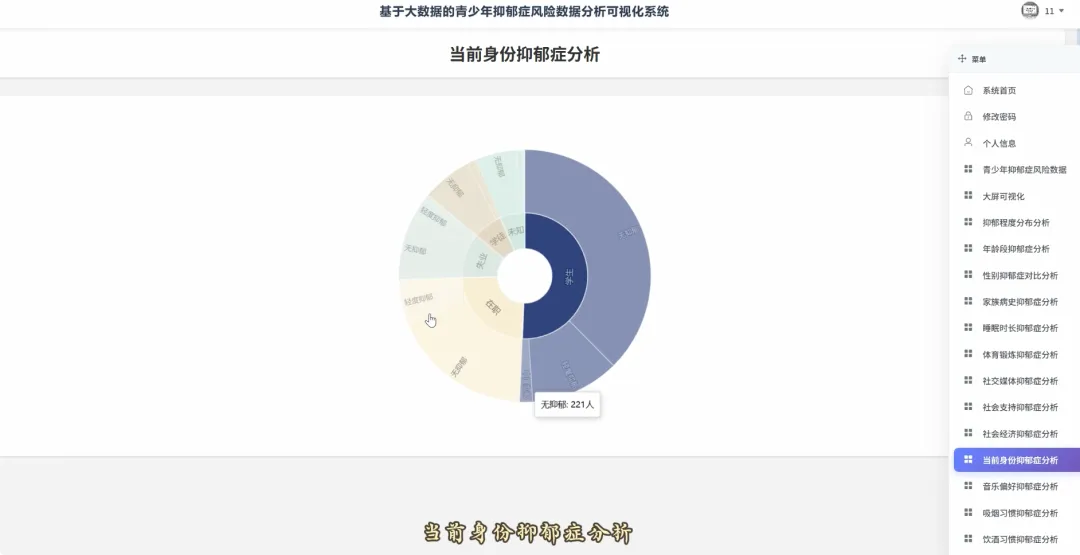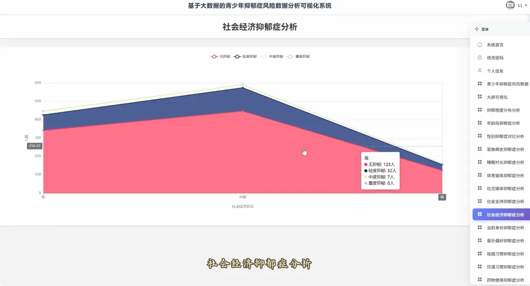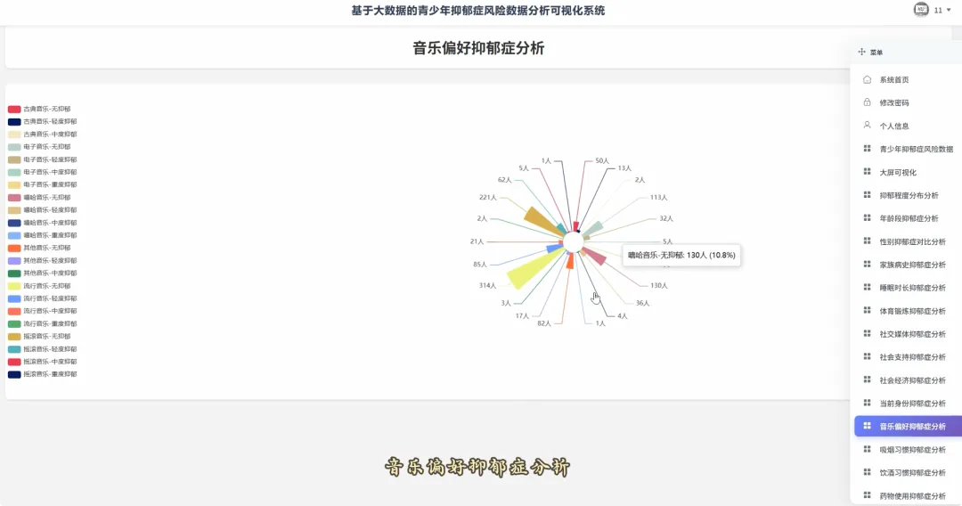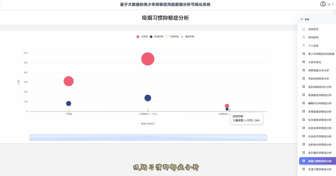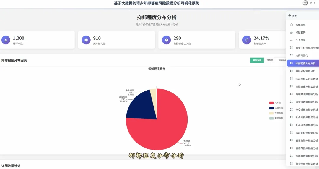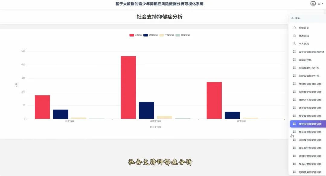 from pyspark.sql import SparkSessionspark = SparkSession.builder.appName("YouthDepressionAnalysis").getOrCreate()df = spark.read.csv("hdfs://namenode:8020/user/hadoop/depression_data.csv", header=True, inferSchema=True)def analyze_overall_depression_distribution(): global df result_df = df.groupBy("depression_severity").count().orderBy("count", ascending=False) data_list = [{"name": row['depression_severity'], "value": row['count']} for row in result_df.collect()] return data_listdef analyze_gender_vs_depression(): global df result_df = df.groupBy("gender", "depression_severity").count().orderBy("gender", "count", ascending=False) data_list = [{"gender": row['gender'], "severity": row['depression_severity'], "count": row['count']} for row in result_df.collect()] return data_listdef analyze_sleep_hours_vs_depression(): global df from pyspark.sql.functions import when, col binned_df = df.withColumn("sleep_category", when(col("sleep_hours") < 6, "睡眠不足(<6小时)").when((col("sleep_hours") >= 6) & (col("sleep_hours") <= 8), "正常睡眠(6-8小时)").otherwise("睡眠过多(>8小时)")) result_df = binned_df.groupBy("sleep_category", "depression_severity").count().orderBy("sleep_category", "count", ascending=False) data_list = [{"sleep": row['sleep_category'], "severity": row['depression_severity'], "count": row['count']} for row in result_df.collect()] return data_list