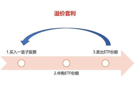 当ETF的市场价格高于其净资产值时,套利者可以买入对应的成分资产。然后通过一项称为“申购”的机制,在一级市场将这些成分资产交回ETF发行商,换取ETF份额,再在二级市场将ETF卖出,套利者从中获利。