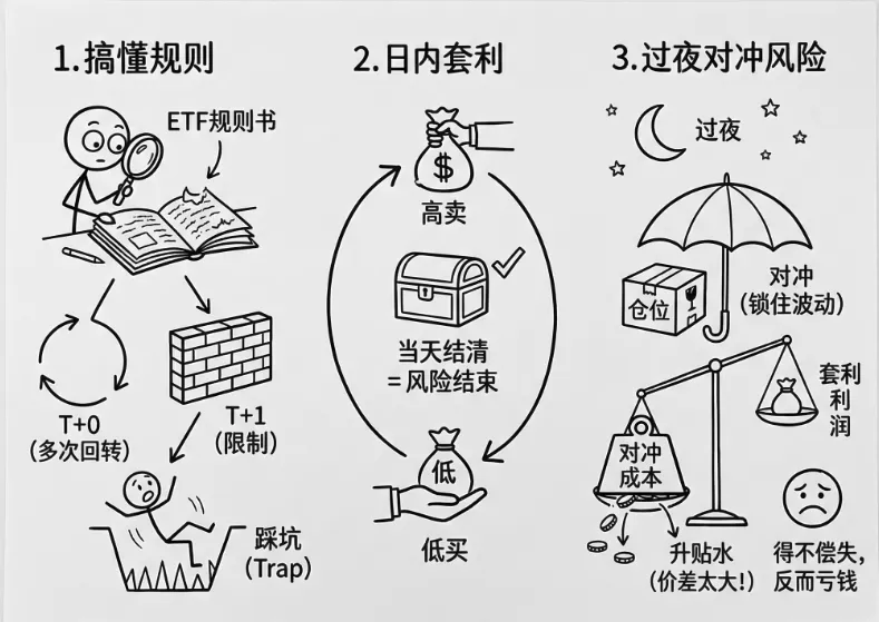 ETF 套利说白了就是 “趁差价吃饭”,但这个饭得当天吃完。为什么?因为如果你当天没把所有步骤都做完,就会留下仓位过夜。过夜就意味着第二天价格可能突然跳一下,你本来能赚的钱可能直接变成亏的。这就是所谓的 “隔夜风险”。