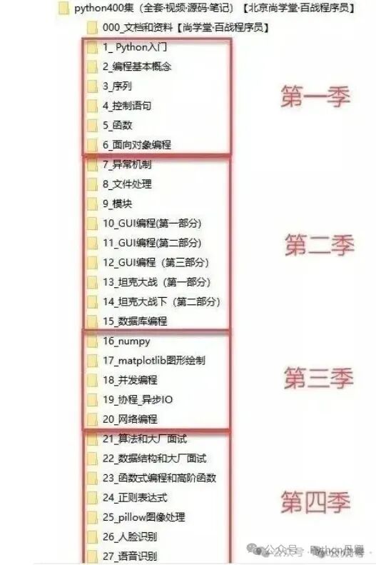作为一门解释型、面向对象的编程语言,Python 自 1991 年正式公布以来,凭借简洁优雅的语法、高效的开发效率和强大的生态体系,成为了编程初学者的首选,更是人工智能、数据分析、网络爬虫等领域的 "主力军"。无论是想转行 IT、提升职场技能,还是单纯对编程感兴趣,一套系统且优质的 Python 教程都能让你少走弯路。今天要给大家分享的,极力推荐的 Python400 集全套教程 —— 来自北京尚学堂・百战程序员,由高淇老师主讲,从零基础到高阶实战全覆盖,堪称 Python 学习的 "宝典"。这套教程不仅内容全面,更注重实战与互动,让你在学习中动手、在实践中成长,轻松攻克 Python 难关。一、400 集分层教学,循序渐进夯实基础