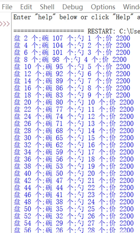 plate = 0bowl = 0spoon = 0price = 0b = []for plate in range(1, round(2200 / 25)): # 盘子数量从少到多 price = _____①_____ # 计算盘子价格for bowl in range(1, _____②_____): # 碗数量从少到多 price1 = price + bowl * 20# 计算盘子加碗的价格for spoon in range(1, round(2200 / 10)): # 勺子数量从少到多 price2 = price1 + spoon * 10# 计算盘子加碗再加勺子的价格if _____③_____: # 如果总价等于2200元if _____④_____ == 110: # 如果个数等于110个 b._____⑤_____([plate, bowl, spoon, price2]) # 将当前数据加入到数组中for a in _____⑥_____: print('盘', a[0], '个;碗', a[1], '个;勺', a[2], '个;价', a[3]) # 打印出数组中符合要求的数据