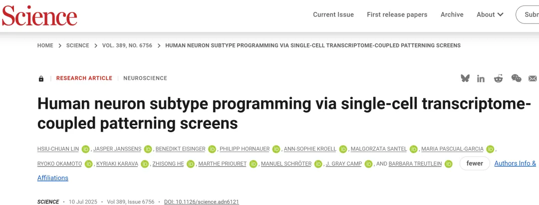2025年7月10日,瑞士苏黎世联邦理工学院Barbara Treutlein团队在Science 在线发表题为“Human neuron subtype programming via single-cell transcriptome-coupled patterning screens”的研究论文,该研究调节发育信号通路并结合TF过表达来探索多能干细胞产生的神经元亚型谱。