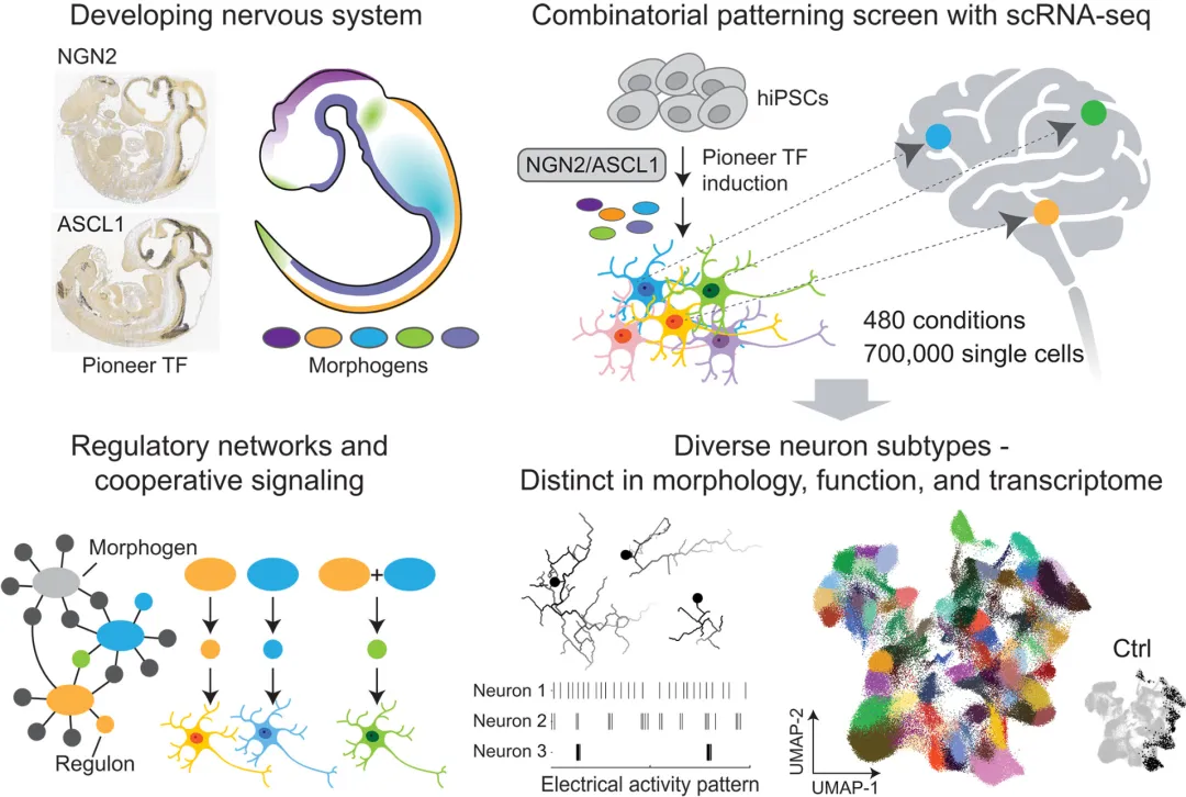 该研究使用多路单细胞转录组读出筛选了480种与TF诱导相结合的形态因子信号调节。对70万个细胞的分析确定了沿神经管发育轴分布的各种兴奋性和抑制性神经元。在TF过表达之前对神经祖细胞进行模式化,通过激活在原代组织对应物中活跃的调控,扩大了神经元的多样性。总之,该研究的方法为编程不同的人类细胞亚型以及研究合作信号如何驱动神经元命运提供了一种策略。
