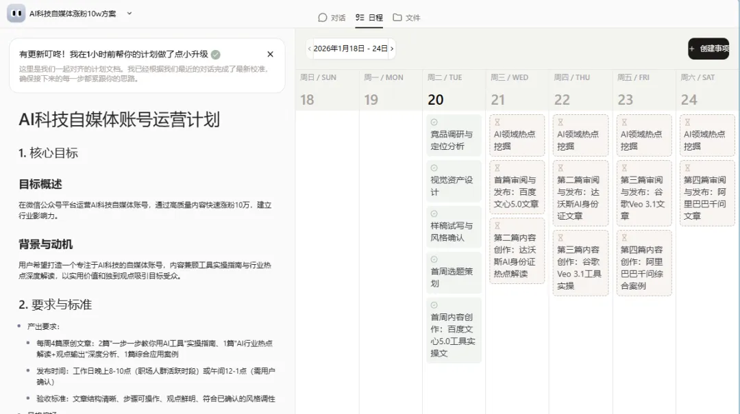你给AI一个长期目标,它自己规划执行路径,定期汇报进展。不用你追着问,它会主动找你。