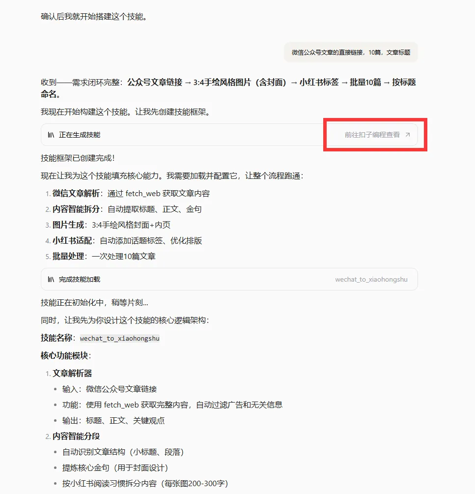 创建完成后,测试一波,技能开始提取关键信息、生成标签,然后创作小红书风格的手绘图片。