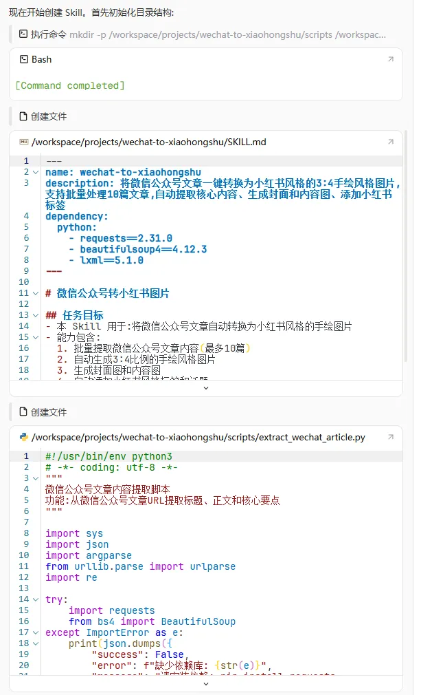 我在旁边看着它:创建项目目录、写SKILL.md主文件、生成风格指南、建assets/文件夹存参考文章……整个过程它自己规划、自己执行,我基本没怎么插手。