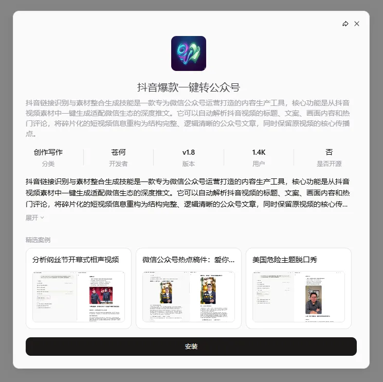 第二个技能是第一个的升级款,可以将抖音爆款视频一键转公众号文章,支持自定义风格。