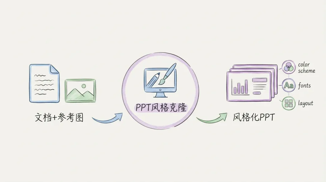 上传文档后解析结构,然后从参考图片中提取配色、字体、版式、图形元素、图片风格等视觉特征,将文档内容与视觉风格融合,为每一页生成详细的中文图片提示词。支持上传多张风格参考图,对比生成不同风格的提示词方案。最后,可选根据生成的图片直接组装输出PPTX文件