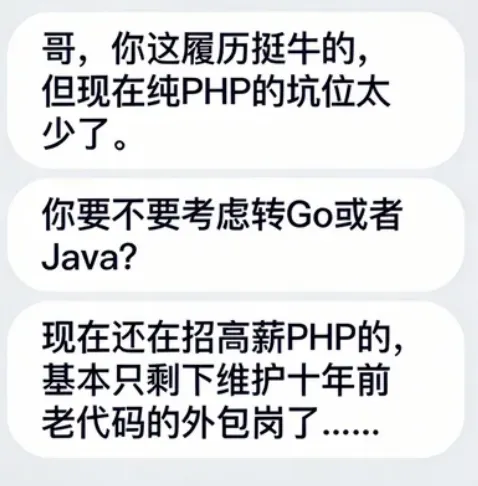 猎头原话是咋说的呢?“哥,你这履历挺牛的,但现在纯PHP的坑位太少了。你要不要考虑转Go或者Java?现在还在招高薪PHP的,基本只剩下维护十年前老代码的外包岗了……”