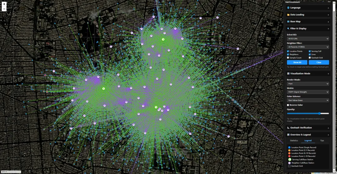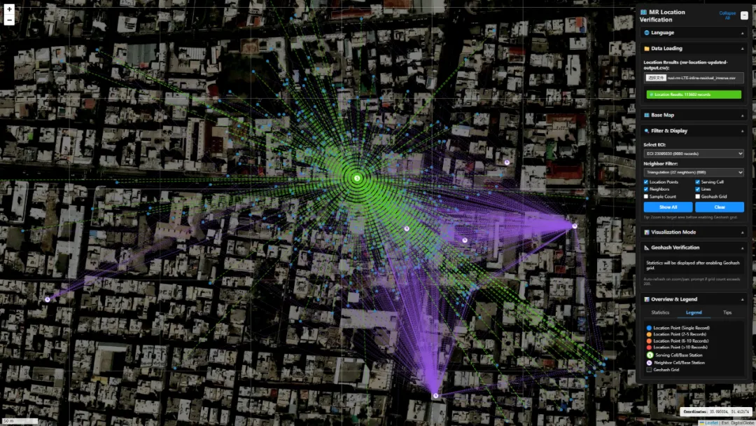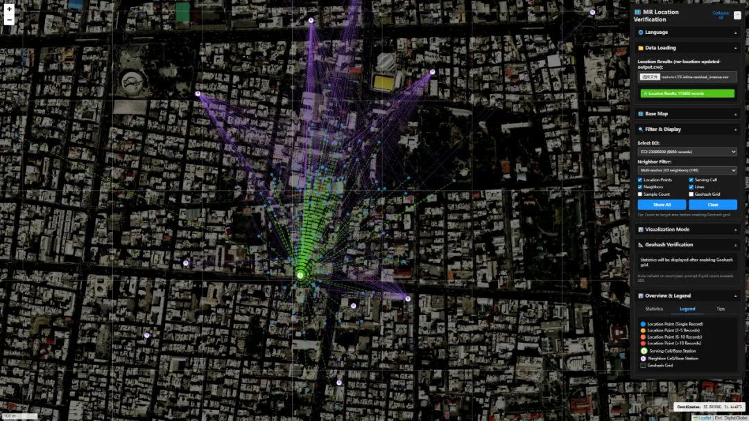 在下图中,大部分定位结果都有两个邻区(紫色连线标出和定位结果的关系),中心的点是服务小区(绿色连线标出关系)。