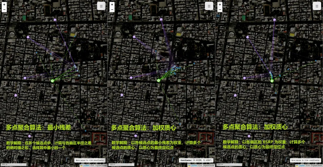 当有两个或更多邻区时,定位算法会得到多个候选位置,这时候就需要做选择题了,比如为每个候选位置计算它的最小残差(它到各邻区距离和各邻区半径的差的绝对值之和,从中取最小的候选),比如为所有候选位置计算其加权质心(权重可以使用最小残差的倒数),AI 建议采用后者作为缺省值。
