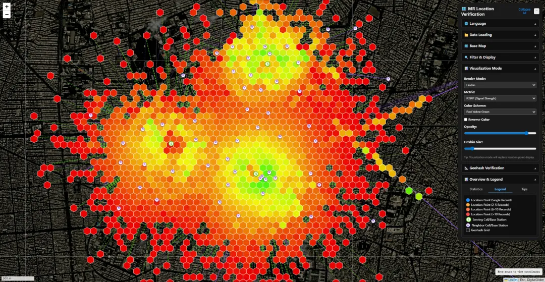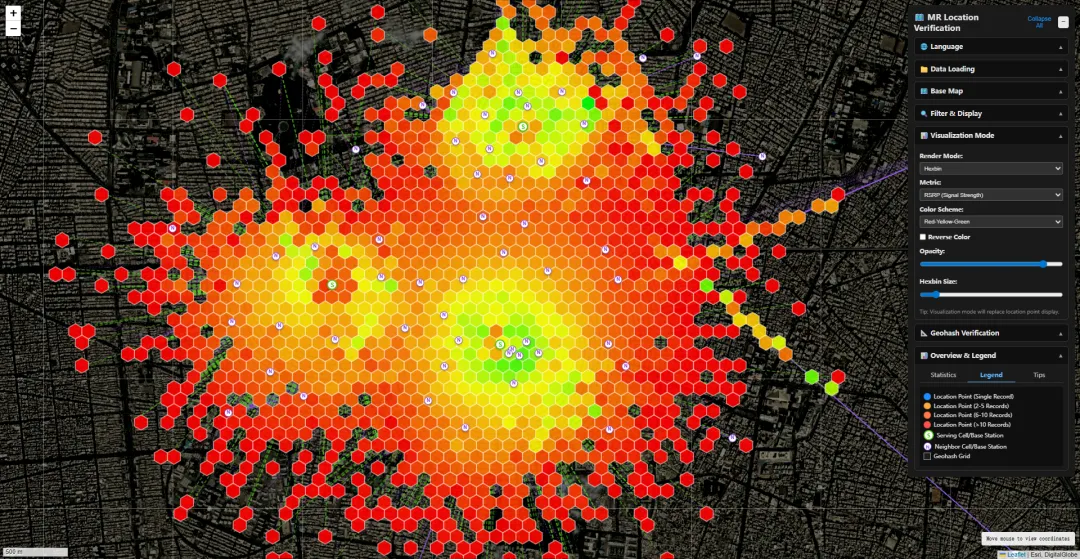 基于这两个选点聚合方案,对同一个基站扇区下具有3+个邻区的定位点做比较,可以看到多数定位点向服务小区略有靠拢,少数定位点略有远离。