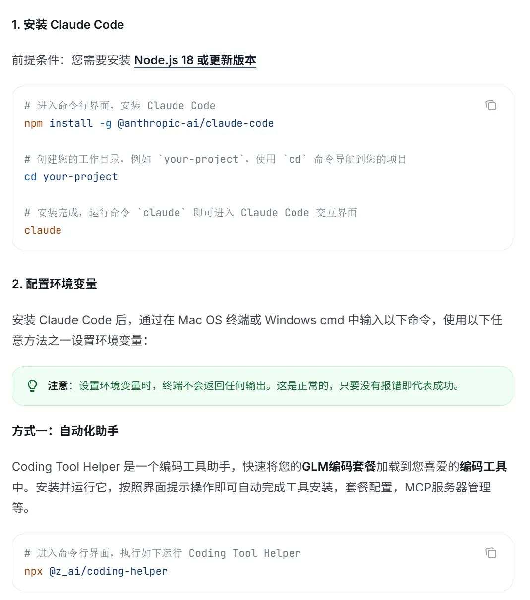 安装 Claude Code 并配置模型 API:Claude Code 的安装与 API 配置,本身并不是本文的重点。如果你使用的是 GLM 系列模型(如 GLM-4.5),BigModel 官方已经给出了非常完整、可复现的配置说明,包括Claude Code 本地安装、API Key 配置、模型接入方式、基础运行验证。这些内容在官方文档中已经写得很清楚,这里不再重复讲一遍👇