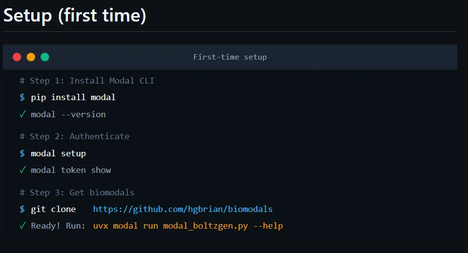 开通 Modal Labs(长期 / 重度调用必需),如果你只是偶尔体验 Claude Code,本地跑一些轻量任务,不一定非要额外平台。但一旦你计划长期使用 Claude Code、运行结构预测 / 生成 / 评估等 计算密集型任务、或者像Adapty 的 Protein Design Skills 那样,把技能封装成可复用流程,那么你几乎一定会遇到一个现实问题——这些任务,不能一直靠本地机器跑。这也是为什么目前很多 protein design skills、AI 生物 workflow,都会基于 Modal Labs 来运行——按需分配算力(CPU / GPU)、任务级别隔离、与 Claude Code / skills 工作流天然适配、更接近“云端实验平台”的使用体验。因此,如果你希望长期、稳定地调用 protein design skills,建议提前在 Modal Labs 官网 开通套餐,并完成最基础的账号与 API 配置。👇