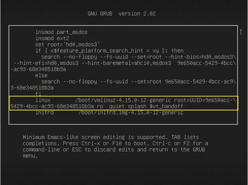 Next press the e key whilst that top line is highlighted. This will take you to the next screen. Use your arrow keys to move down to the line highlighted in the picture below. Use the arrow key until you reach the end of that line.接下来,当顶部那一行被高亮显示时,按下 e 键。这将带你进入下一个屏幕。使用方向键向下移动到下图中高亮显示的那一行。使用方向键直到到达该行的末尾。