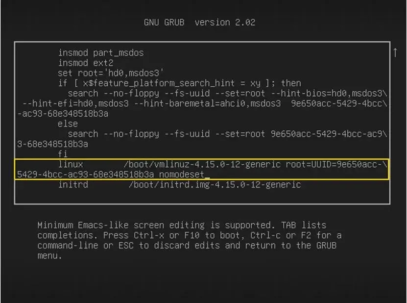 Press the backspace key repeatedly until you remove: ro splash quiet $vt_handoff and replace that text with: nomodeset so that it looks like the picture below.随后反复按退格键,直到删除:ro splash quiet $vt_handoff,并将该文本替换为:nomodeset,使其看起来像下图。