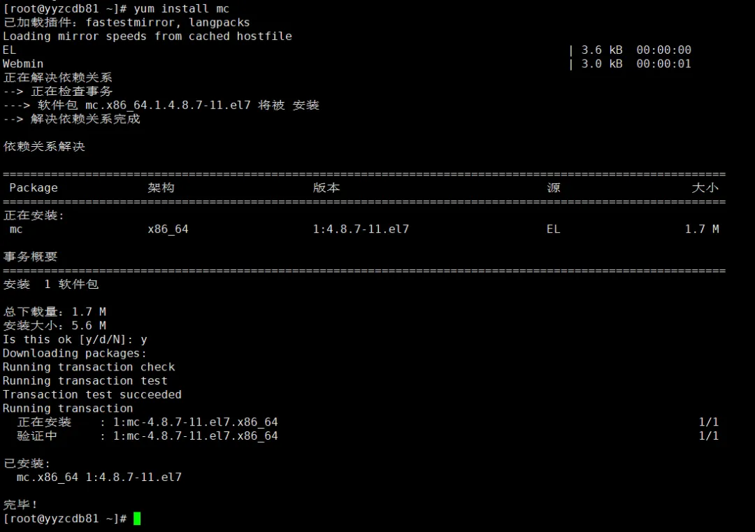 [root@yyzcdb81 ~]# yum install mc已加载插件:fastestmirror, langpacksLoading mirror speeds from cached hostfileEL | 3.6 kB 00:00:00 Webmin | 3.0 kB 00:00:01 正在解决依赖关系--> 正在检查事务---> 软件包 mc.x86_64.1.4.8.7-11.el7 将被 安装--> 解决依赖关系完成依赖关系解决========================================================================================================= Package 架构 版本 源 大小=========================================================================================================正在安装: mc x86_64 1:4.8.7-11.el7 EL 1.7 M事务概要=========================================================================================================安装 1 软件包总下载量:1.7 M安装大小:5.6 MIs this ok [y/d/N]: yDownloading packages:Running transaction checkRunning transaction testTransaction test succeededRunning transaction 正在安装 : 1:mc-4.8.7-11.el7.x86_64 1/1 验证中 : 1:mc-4.8.7-11.el7.x86_64 1/1 已安装: mc.x86_64 1:4.8.7-11.el7 完毕![root@yyzcdb81 ~]#