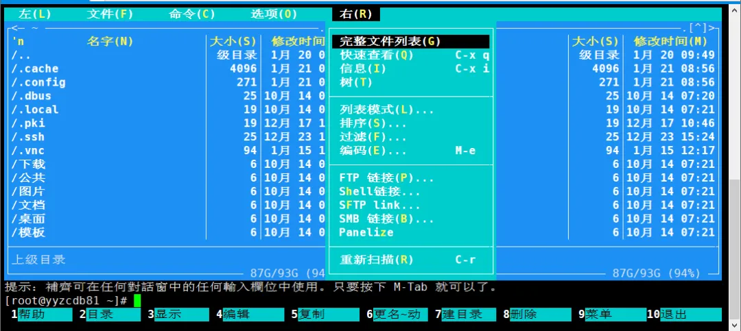上面介绍的是Midnight Commander的基本功能,更多高级特性需在实际使用中逐步探索和发现。