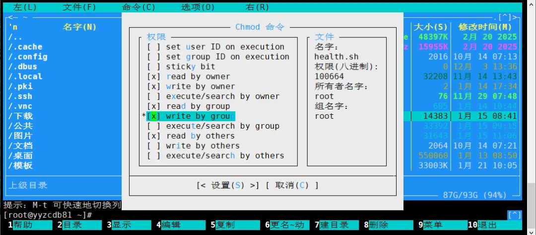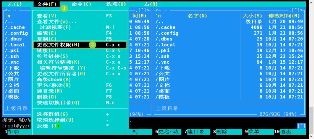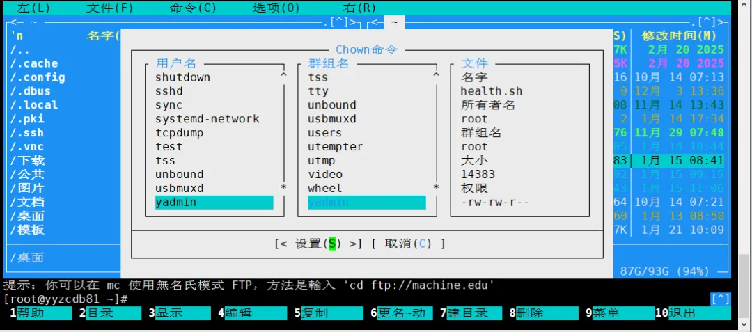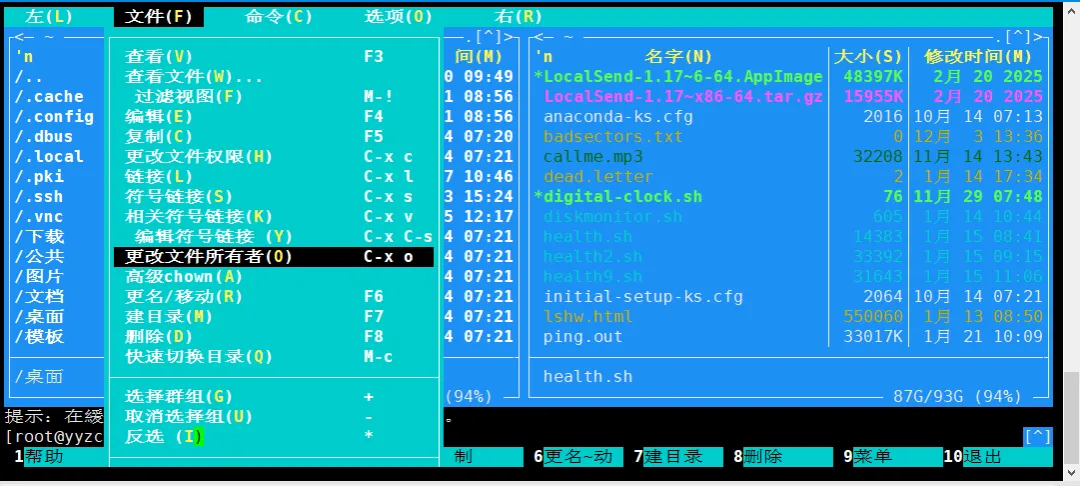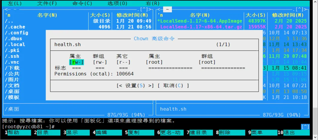 MC 还提供 高级所有者设置(Advanced Chown) 功能,可同时调整权限与所有者。操作路径为:F9 → 文件 → 高级 chown(A)。
