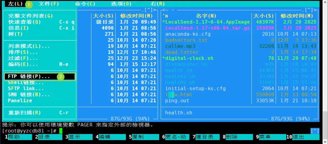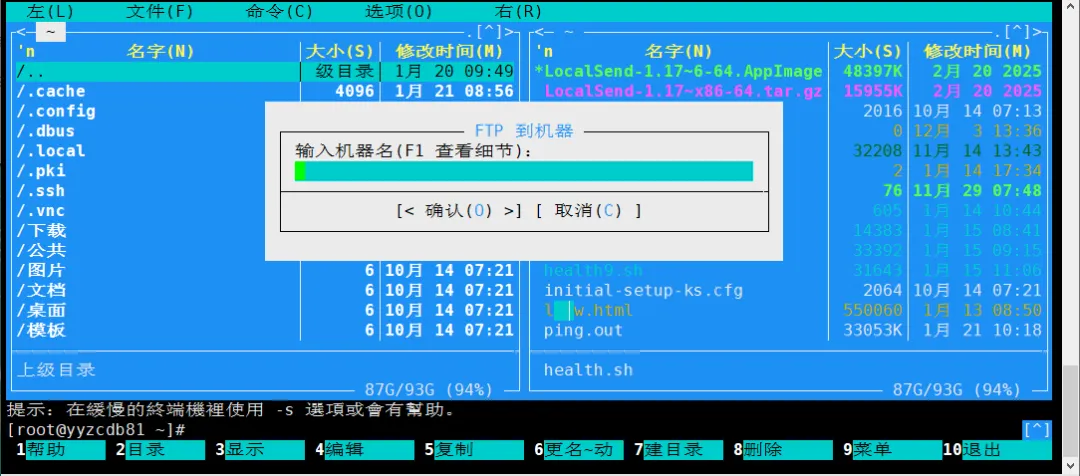MC 的双窗格不仅可显示本地目录,还能通过 FTP 连接远程服务器,此时 MC 相当于一个 FTP 客户端。