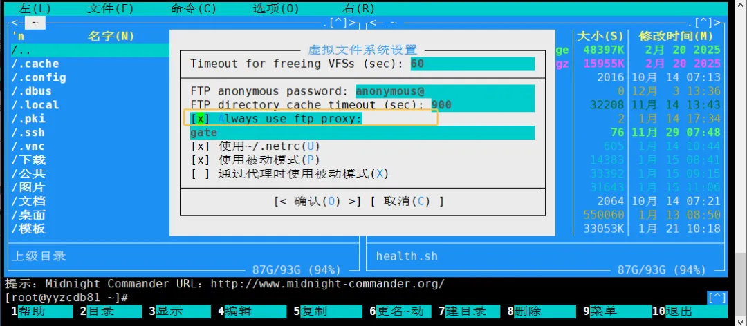 若网络环境需使用代理,可配置 MC 启用 FTP 代理:F9 → 选项 → 虚拟文件系统 → Always use ftp proxy。