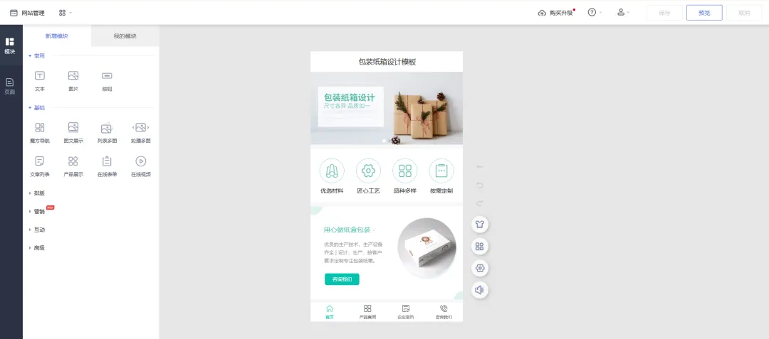 比如说我们要做一些企业官网,是肯定是可以支持的,侧重于展示。我们要做这种电商类型的,比如说商品的分类展示,线上下单、在线支付,这个也是可以的。比如说我们的会员系统数据分析的功能,都可以在后台找到对应的一些产品模块,也就说我们的不仅是界面支持灵活的设计,后台的功能也是可以根据我们不同的需求选择不同类型的这种网站,那自助建站平台它也会不断的进行这个功能的更新优化,为我们用户提供更好的这种使用体验。