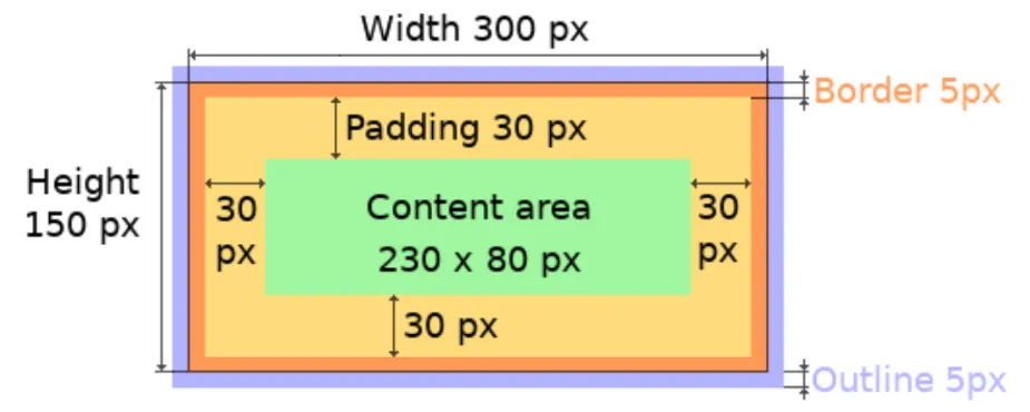 从外到内:1. 边界(Outline) - 最外层,通常用于高亮2. 边框(Border) - 对象的边框3. 内边距(Padding) - 边框和内容之间的空隙4. 内容(Content) - 实际显示内容的部分