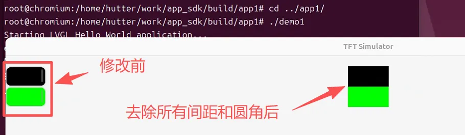void create_tight_layout() { //创建对像 lv_obj_t * btn1 = lv_obj_create(lv_scr_act()); lv_obj_t * btn2 = lv_obj_create(lv_scr_act()); //设置大小 lv_obj_set_size(btn1, 80, 40); lv_obj_set_size(btn2, 80, 40); //设置位置 lv_obj_align(btn1, LV_ALIGN_TOP_MID, 0, 20); // 顶部,向下20 lv_obj_align_to(btn2, btn1, LV_ALIGN_OUT_BOTTOM_MID, 0, 0); // btn1下方10 //设置颜色 lv_obj_set_style_bg_color(btn1, lv_color_hex(0x000000), LV_PART_MAIN); lv_obj_set_style_bg_color(btn2, lv_color_hex(0x00FF00), LV_PART_MAIN); //去除所有间距和圆角 lv_obj_set_style_pad_all(btn1, 0, LV_PART_MAIN); lv_obj_set_style_border_width(btn1, 0, LV_PART_MAIN); lv_obj_set_style_outline_width(btn1, 0, LV_PART_MAIN); lv_obj_set_style_radius(btn1, 0, LV_PART_MAIN); // 去掉圆角 lv_obj_set_style_pad_all(btn2, 0, LV_PART_MAIN); lv_obj_set_style_border_width(btn2, 0, LV_PART_MAIN); lv_obj_set_style_outline_width(btn2, 0, LV_PART_MAIN); lv_obj_set_style_radius(btn2, 0, LV_PART_MAIN); // 去掉圆角}
