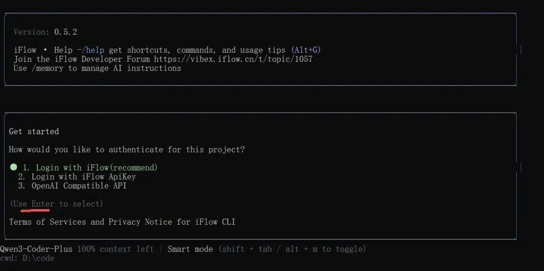 安装完成后,输入 iflow,看到下面这个界面,恭喜你,大功告成!