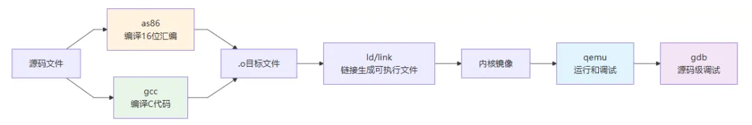 as86、ld86 等专用工具,用于编译实模式引导代码,处理 bootsect.s、setup.s 等汇编文件的编译和链接。你也可以在下面调试环境流程图中,对照这些工具所处的位置和作用。