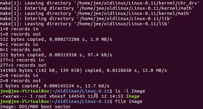 最后生成 Image 镜像文件,使用file命令行工具你会看到Image文件大约144KB大小,file命令会显示它是"DOS/MBR boot sector"格式。这意味着这个文件不仅包含内核代码,还包含了完整的主引导记录,可以直接被BIOS识别和引导。
