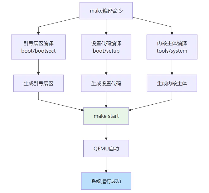 首先是引导扇区代码的编译,这部分使用as86汇编器,生成512字节的引导扇区。接下来是setup.s的编译,这段代码负责从实模式切换到保护模式。然后是最核心的部分——内核主体的编译,包括进程管理、内存管理、文件系统等各个模块。