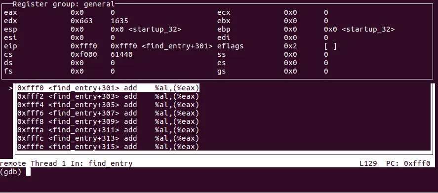 最后,内核开始执行startup_32函数,这是保护模式下的入口点。设置断点并跟踪: