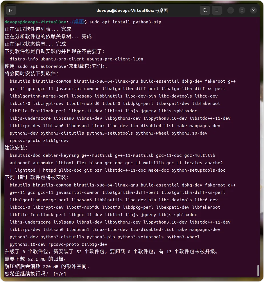 假设您已经在 Ubuntu 系统上安装了 Python;然而,为了确认,我们可以执行以下命令以确保 Python 已安装在我们的系统上。现在,为了管理和安装 Python 所需的依赖项,我们可以使用其包管理器——Pip(Python 的包安装器)。它默认不会安装在您的 Ubuntu 系统上,需要使用以下命令手动安装:sudo apt install python3-pip