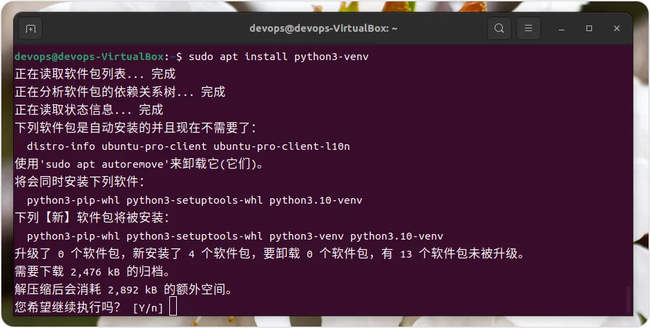 虽然这是本文中的一个纯可选步骤,但建议创建新 Python 项目的用户创建虚拟环境。虚拟环境提供了一个隔离的环境,允许用户分别管理不同项目的依赖项。sudo apt install python3-venv