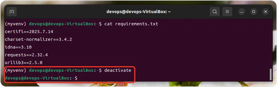 如果您已经在 Ubuntu 上为 Python 项目安装了所有所需的依赖项,并且现在希望与他人共享或将其部署到生产环境中而不改变依赖项版本,该怎么办?简单来说,您已经用特定版本的依赖项测试了 Python 程序。现在,在部署时,项目必须使用我们测试应用程序时所用的相同版本的库,而不是更新后的版本。在这种情况下,我们可以将已安装的包及其版本冻结到 requirements.txt 文件中。此命令将生成一个requirements.txt文件,列出所有已安装的包及其版本。pip freeze > requirements.txt