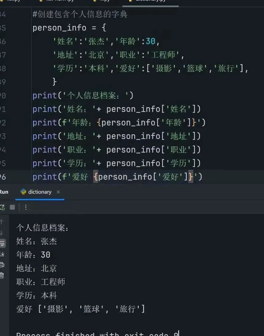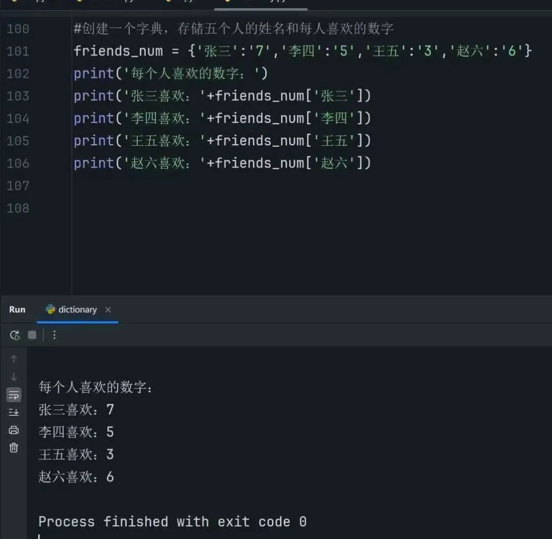 二.使用字典存储了“五个人分别喜欢的数字”打印每个人的名字和喜欢的数字