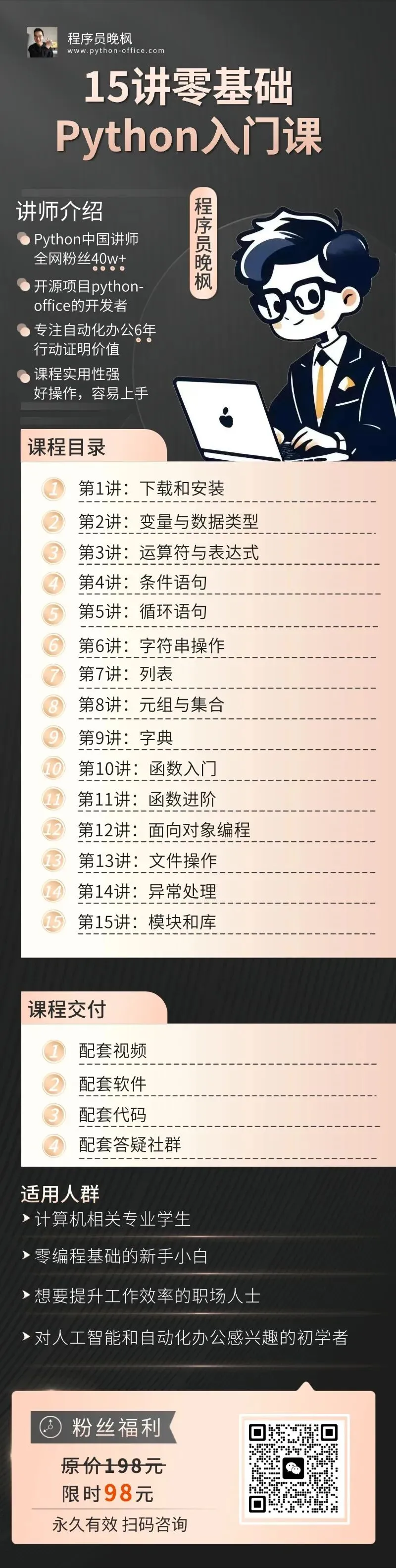 15讲基础或者添加微信:python-office,备注"Python课程",即可获取购买链接。
