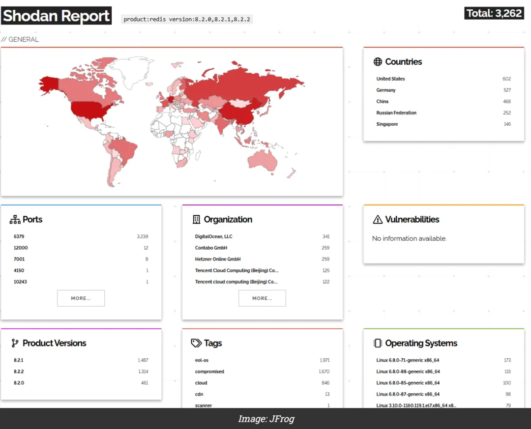 根据Shodan扫描数据,全球约有3262台服务器运行受影响的Redis版本,其中美国、德国、中国的暴露数量位居前三。由于Redis默认不强制身份验证,该漏洞可被未经授权的远程攻击者直接利用,成为黑客的重点攻击目标。