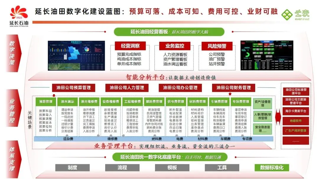 让财务管控融入业务运行的各个环节,对业务全新赋能,让业务有支撑、过程有监管、业财能同步,有效解决传统管理中业务和财务工作脱节、目标不统一、数据不互通、协作不顺畅的难题。延长油田业财一体数字化平台并非简单的工具升级,而是构建了一个覆盖生产经营全链条、贯通业务财务各环节的智慧管理生态。