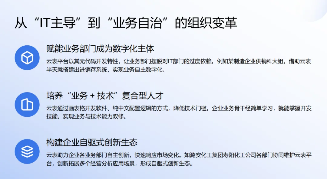 而且云表平台采用“扶上马,送一程”的开发模式,既帮助企业搭建系统,还协助企业培养数字化人才梯队,软件功能后续需要扩展或变更时,企业自有团队也能完成软件的迭代,这一优势将切实解决企业对软件厂商的依赖。全新工具和模式的采用,有助于让延长油田对数字化建设实现自主可控,也为数字化的持续推进提供了有力保障。