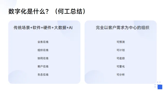 在何工看来,数字化的变革,就是将传统的业务场景进行重构,加入软硬件的维度,把原来的所有生产要素进行重新组合创新,完全以客户的需求为中心,做到业务在线、组织在线、协同在线、客户在线、生态在线,所有决策、行为和结果做到可预测、可计划、可追踪、可量化、可分析。