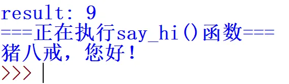 def my_max(x, y) : # 返回一个表达式return x if x > y else y# 定义一个函数,声明一个形参def say_hi(name) :print("===正在执行say_hi()函数===")return name + ",您好!"a = 6b = 9# 调用my_max()函数,将函数返回值赋值给result变量result = my_max(a , b) print("result:", result)# 调用say_hi()函数,直接输出函数的返回值print(say_hi("猪八戒"))