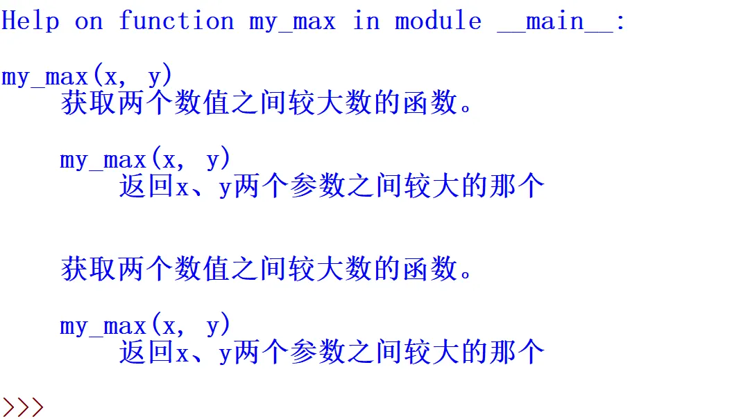 如果你的函数写出来想加入一些功能说明,怎么调用等,就可以提供说明文档。def my_max(x, y) : ''' 获取两个数值之间较大数的函数。 my_max(x, y) 返回x、y两个参数之间较大的那个 ''' # 定义一个变量z,该变量等于x、y中较大的值 z = x if x > y else y # 返回变量z的值 return z# 使用help()函数查看my_max的帮助文档help(my_max)print(my_max.__doc__)