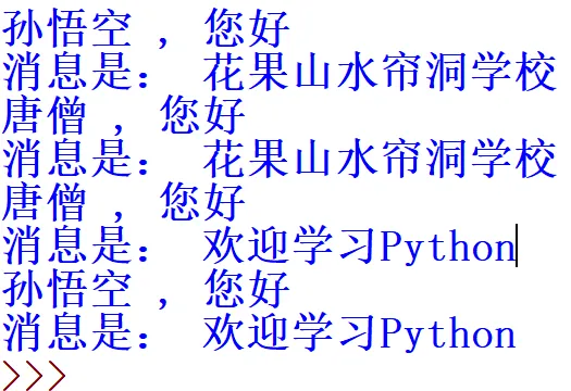 参数默认值(default parameter value)# 为两个参数指定默认值def say_hi(name = "孙悟空", message = "花果山水帘洞学校"):print(name, ", 您好")print("消息是:", message)# 全部使用默认参数say_hi()# 只有message参数使用默认值say_hi("唐僧")# 两个参数都不使用默认值say_hi("唐僧", "欢迎学习Python")# 只有name参数使用默认值say_hi(message = "欢迎学习Python")