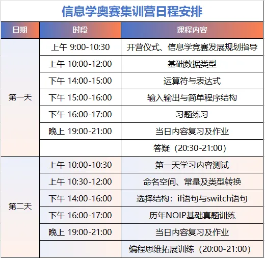 设备要求:所有学员需自备笔记本电脑(建议配置:内存8G及以上,硬盘剩余空间50G以上),并提前安装好C++编程环境(推荐使用Dev-C++ 5.11版本或Code::Blocks),开营前会统一进行环境测试,请务必确保电脑可正常联网、无系统故障