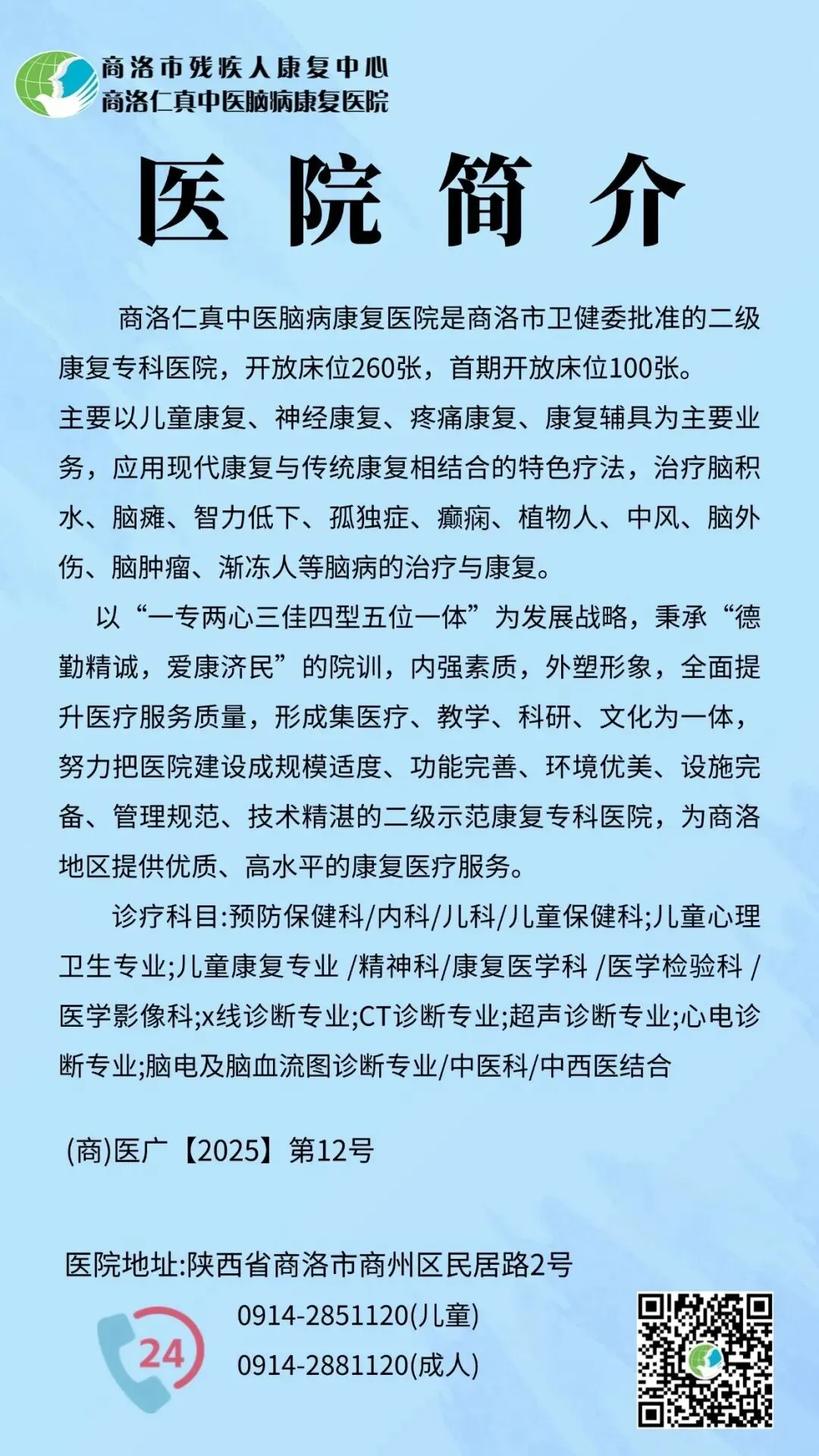 商洛仁真中医脑病康复医院(商洛市残疾人康复中心)是商洛市卫健委批准的二级康复专科医院,开放床位260张,首期开放床位100张。主要以儿童康复、神经康复、疼痛康复、康复辅具为主要业务,应用现代康复与传统康复相结合的特色疗法,治疗脑积水、脑瘫、智力低下、孤独症、癫痫、植物人、中风、脑外伤、脑肿瘤、渐冻人等脑病的治疗与康复。