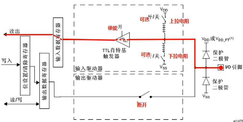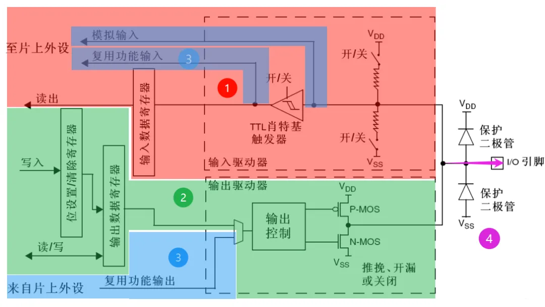 上图中④为芯片连接外部引脚部分。③为芯片内部功能其它外设功能,比如检测外部模拟量(电压)、与其它传感器通信、输出内容显示到液晶屏幕或者OLED屏上等等,需要使用到ADC、IIC、SPI、UART等,这些和GPIO一起,都属于单片机内部的功能模块,一般称作外设。对GPIO进行输入和输出配置的初始化过程就是对功能框图中不同位置的“开关”进行打开和关闭的过程。输出数据,即使用代码,将数据写入位设置/清除寄存器和输出数据寄存器的过程。输入数据,就是从输入数据寄存器读出内容的过程。而输入数据寄存器会根据触发器输出内容及时更新,触发器的输入就来自外部引脚。