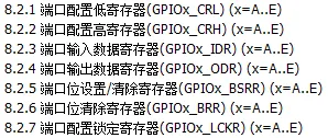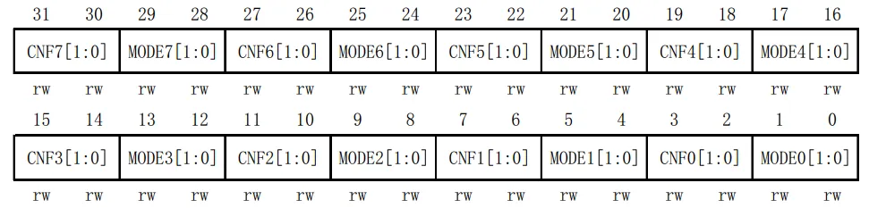 - 两个32位配置寄存器(GPIOx_CRL, GPIOx_CRH)