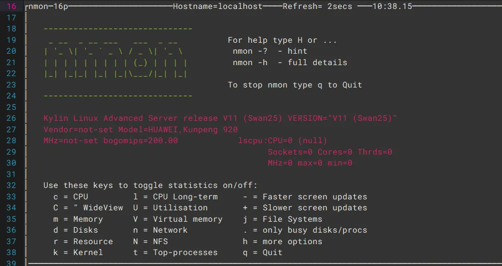 # 采集数据,每10秒一次,共120次(20分钟)nmon -f -s 10 -c 120# 生成文件-rw-r--r-- 1 root root 36112 1月12日 10:39 localhost_260112_1039.nmon